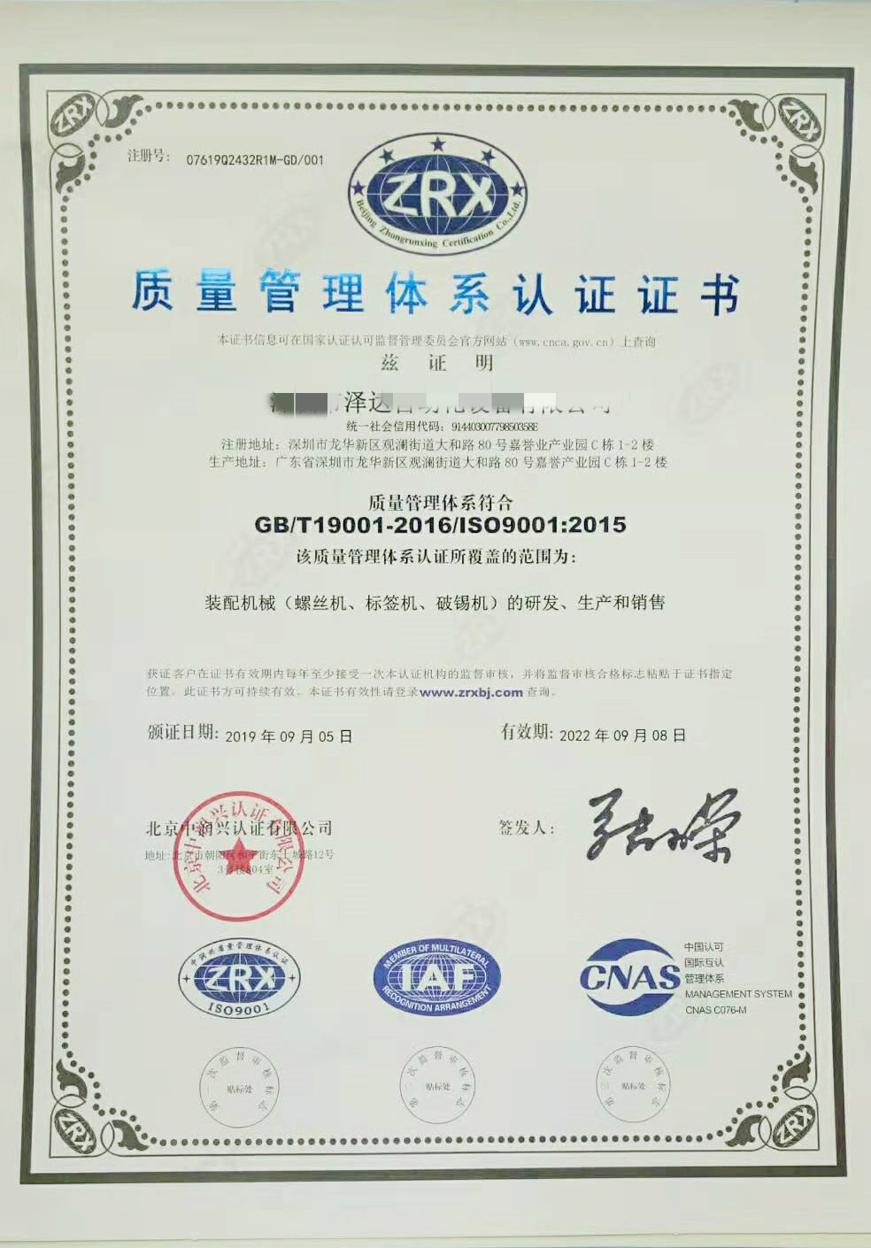 關于我們已通過ISO9001質量管理體系認證